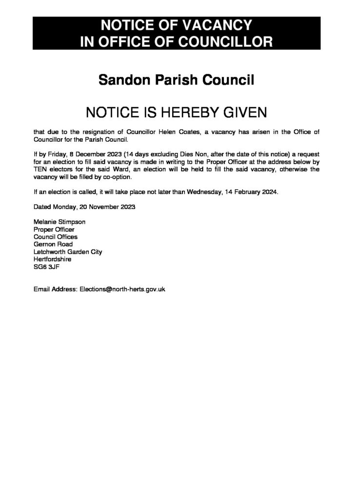 If by 25 April, 2025 (14 days excluding Dies Non, after the date of this notice) a request for an election to fill said vacancy is made in writing to the Proper Officer at the address below by TEN electors for the said Parish, an election will be held to fill the said vacancy, otherwise the vacancy will be filled by co-option.
